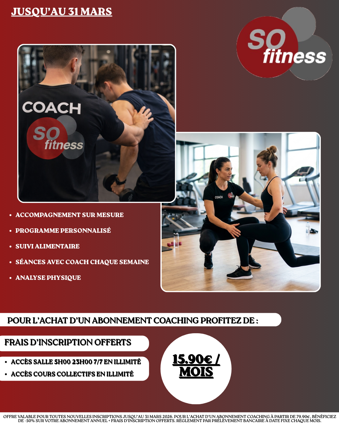 Pour l'achat d'un abonnement coaching, profitez de votre accès salle et cours en illimité 7/7 5h00 - 23h00 pour 15.90€ / mois et des frais d'inscription offerts
